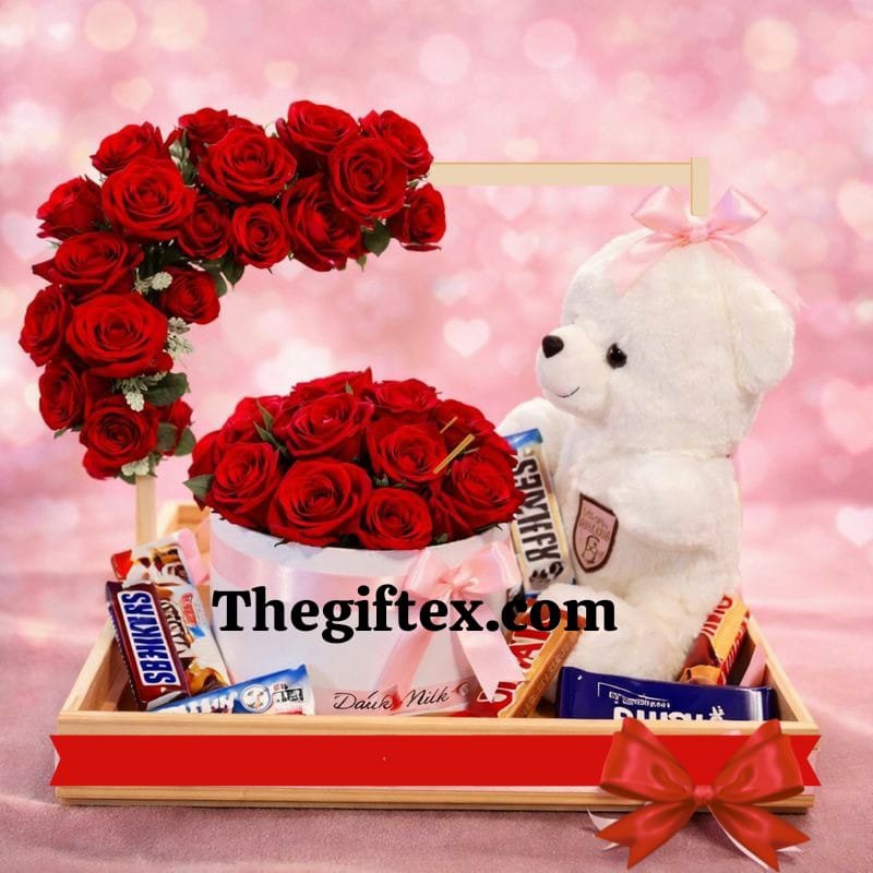 A complete romantic basket with a box of red roses, a large teddy bear, and chocolates — perfect for Valentine’s Day.